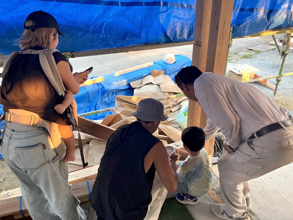 棟梁の説明を受けながら、建物を清める『四方固めの儀』を行い工事の安全と無事を祈ります。